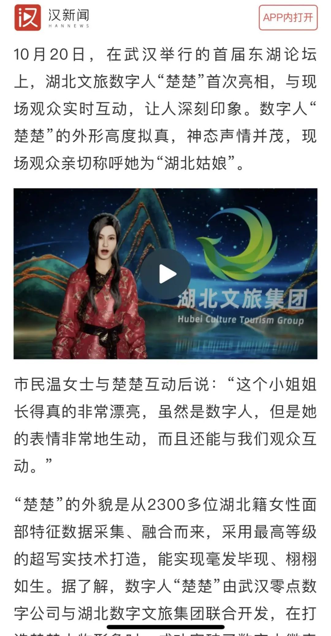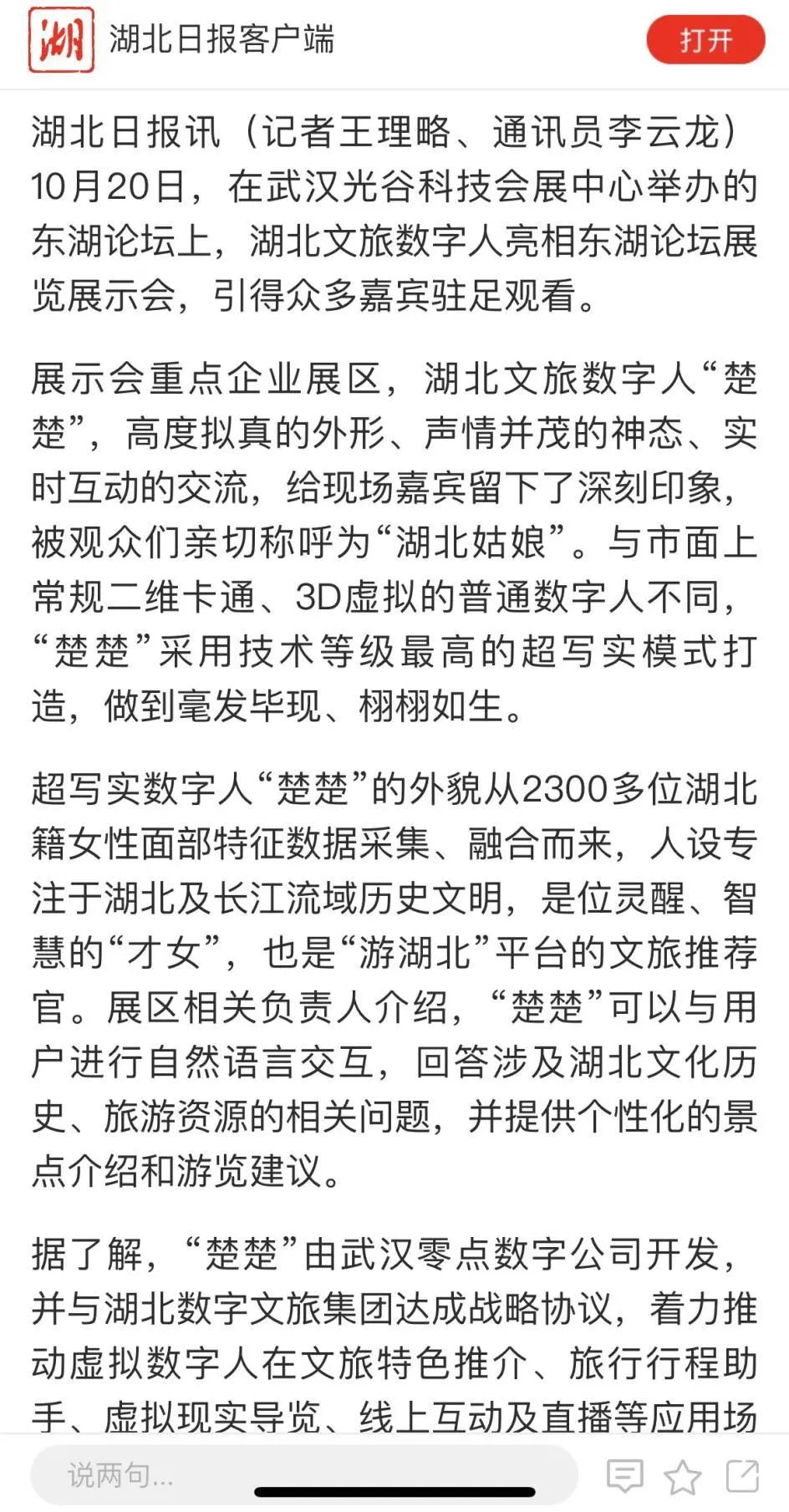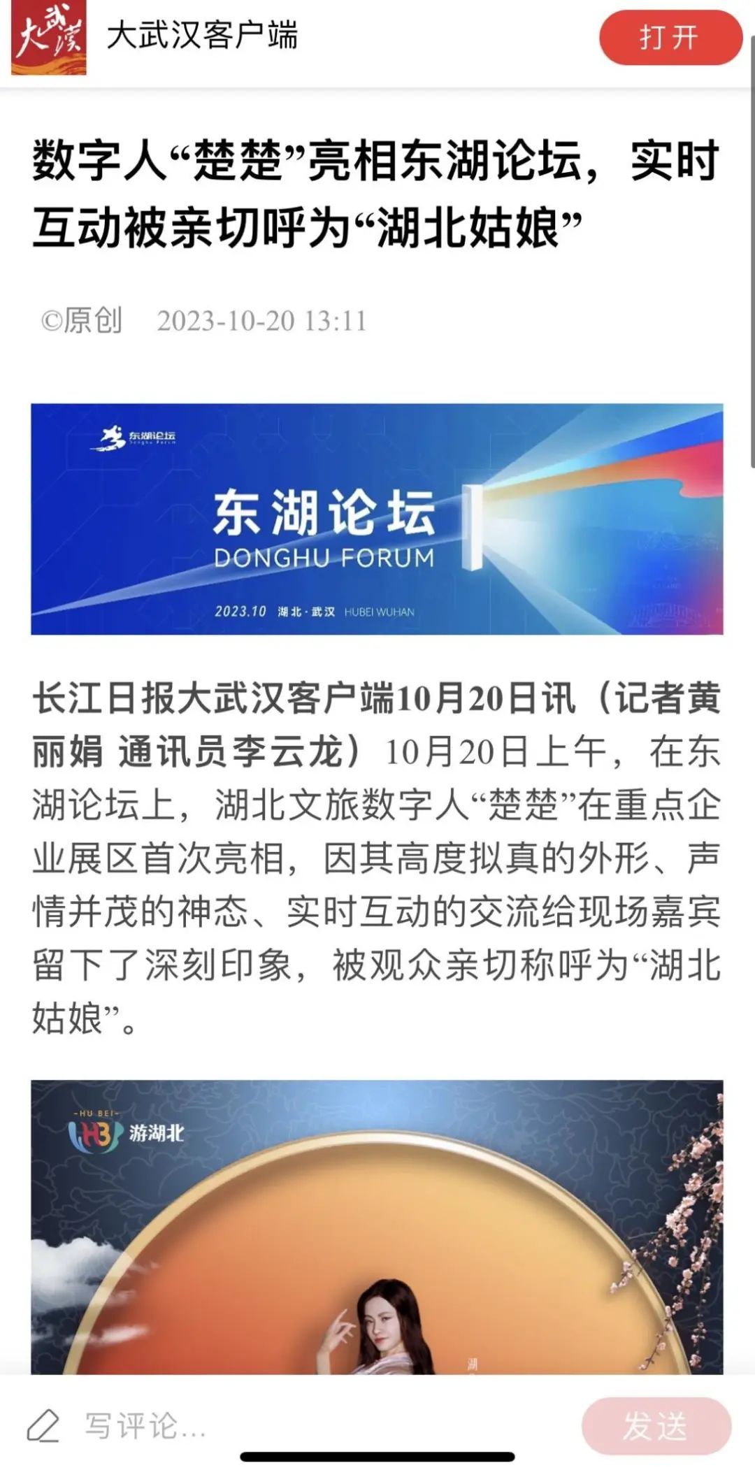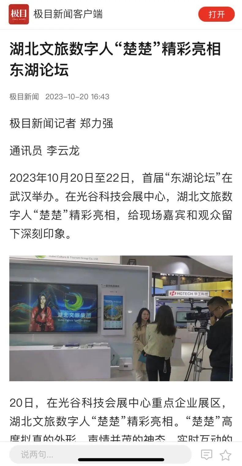 數(shù)旅集團(tuán)數(shù)字人成為“東湖論壇展示會(huì)”重點(diǎn)企業(yè)展區(qū)的亮點(diǎn),引來各方關(guān)注,各大媒體爭相報(bào)道。期間長江日?qǐng)?bào)、新華網(wǎng)、武漢廣播電視臺(tái)、湖北日?qǐng)?bào)、荊楚網(wǎng)、極目新聞等主流媒體紛紛聚焦,進(jìn)行了全方位、多視角報(bào)道。