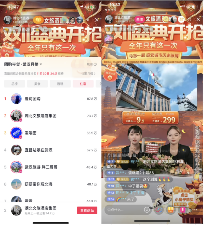 湖北數(shù)字文旅集團(tuán)為本次雙十一直播活動(dòng)服務(wù)商,通過(guò)湖北文旅酒店集團(tuán)抖音官方賬號(hào)以“雙十一游湖北·酒店必囤攻略“為主題進(jìn)行直播帶貨。直播現(xiàn)場(chǎng)氣氛熱烈,多款產(chǎn)品上架即刻秒空,送福袋、特價(jià)秒殺、爆款產(chǎn)品等……各種驚喜、福利不斷,現(xiàn)場(chǎng)掀起一波又一波互動(dòng)高潮。