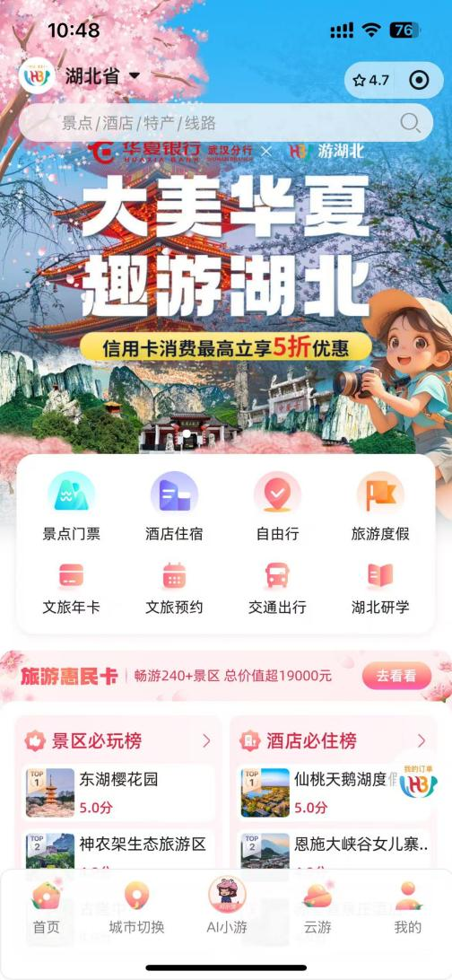 在數(shù)字化消費(fèi)場景深度融合的背景下,雙方構(gòu)建“三重惠民”服務(wù)體系:一是消費(fèi)立減,用戶通過“游湖北”微信小程序預(yù)訂景區(qū)門票、精品酒店、特色年卡及品質(zhì)跟團(tuán)游產(chǎn)品時(shí),使用微信支付(綁定華夏銀行信用卡),可享最高5折優(yōu)惠,單筆立減50元封頂;二是場景互通,整合省內(nèi)熱門景區(qū)、優(yōu)質(zhì)酒店資源形成消費(fèi)矩陣;三是長效賦能,通過“月月享優(yōu)惠”機(jī)制(每自然月限享1次)持續(xù)激發(fā)消費(fèi)活力。