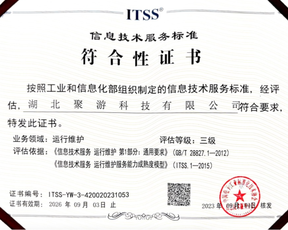 聚游科技獲ITSS信息技術服務運行維護標準符合性三級證書